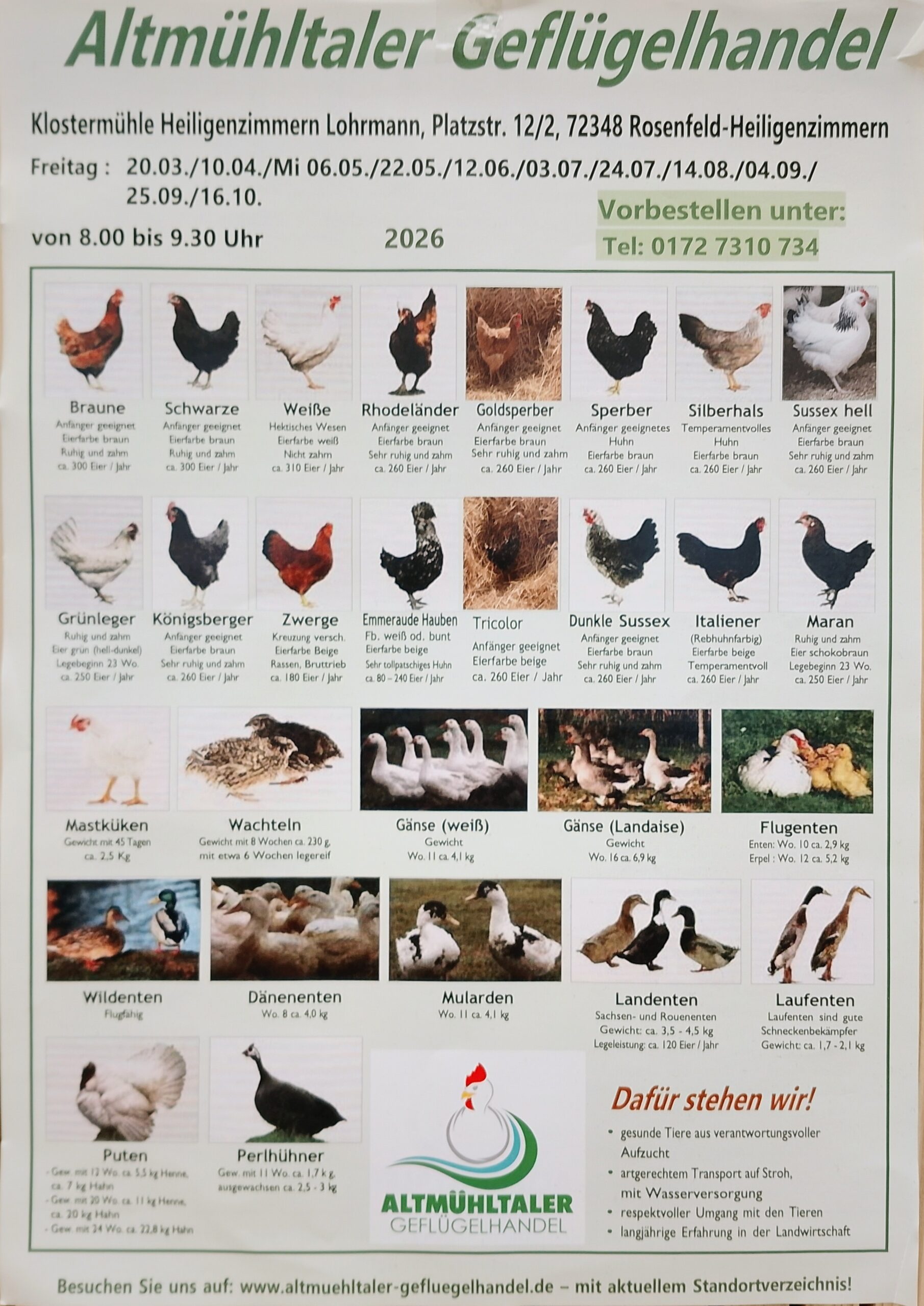 Der Altmühltaler Geflügelhandel ist ab März 2026 wieder im Ländle. Hier finden Sie die aktuellen Termine.